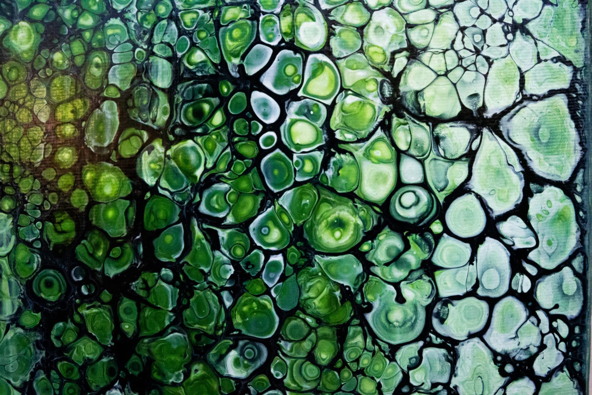 Un’opera astratta che respira verde, profondità e quiete. Le tonalità di verde muschio e nero si intrecciano in una texture viva, simile alla superficie di pietra e foglia bagnata dalla pioggia.