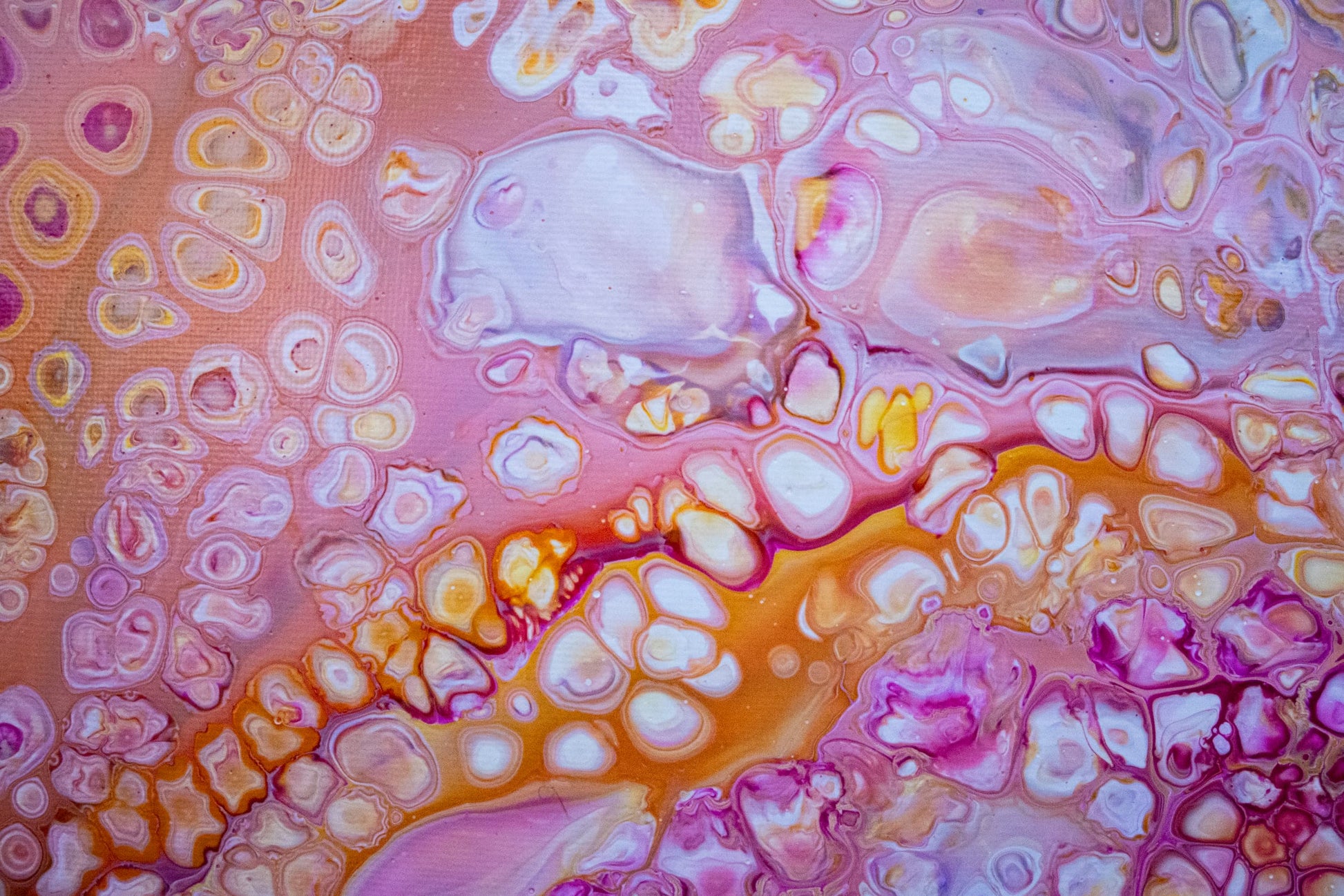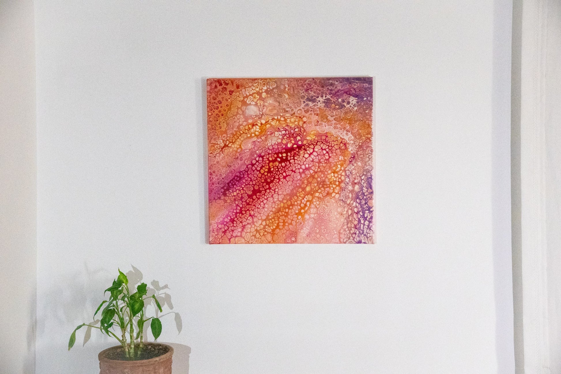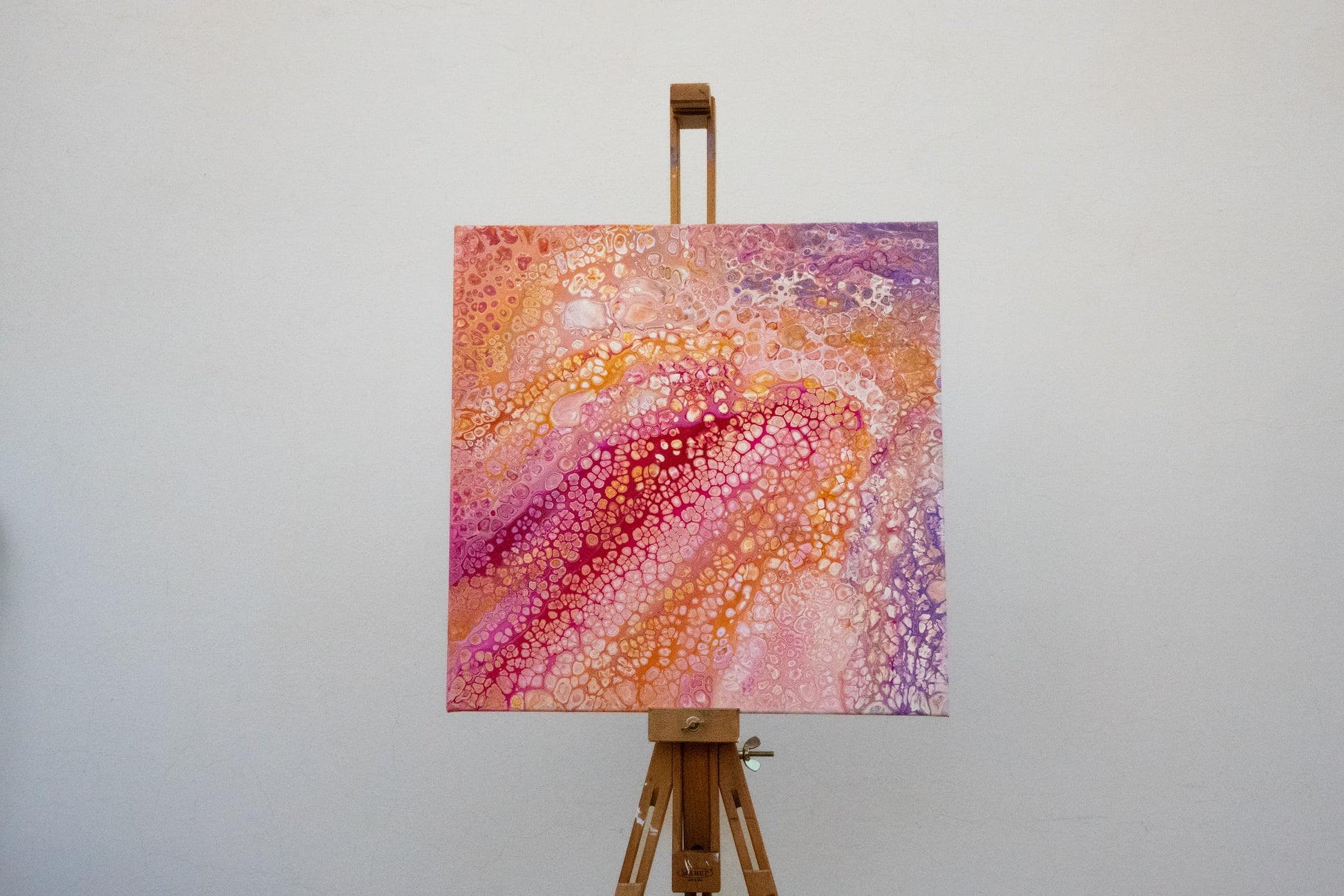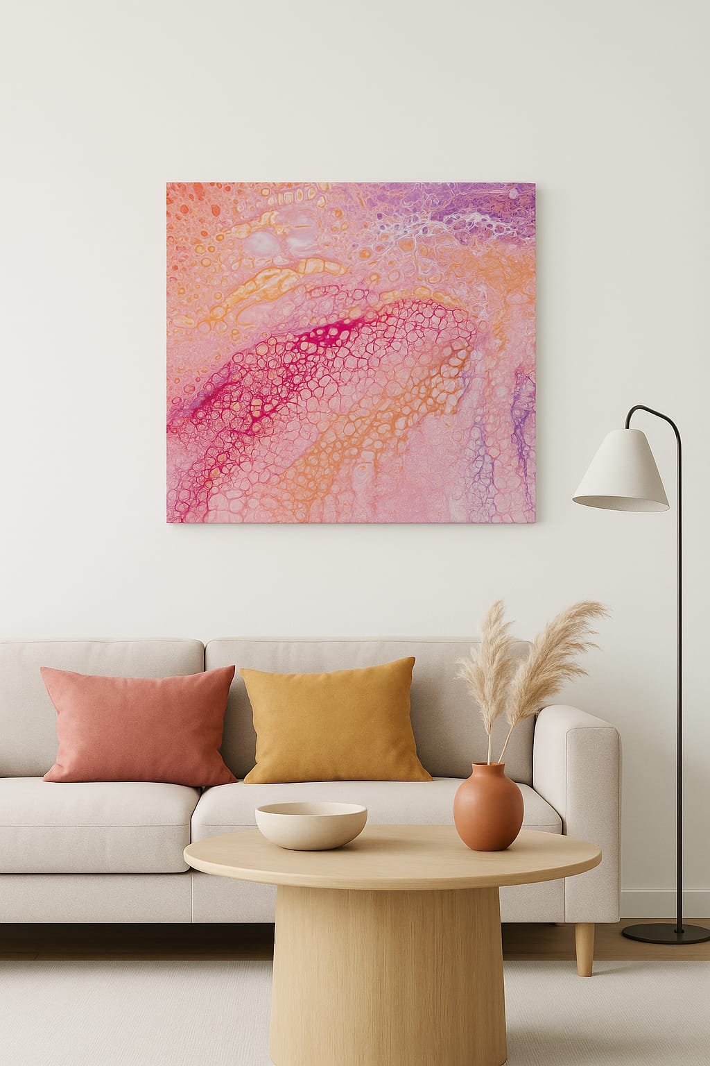Realizzato interamente a mano con acrilico su tela 50x50 cm, questo quadro astratto avvolge lo sguardo con sfumature di rosa, fucsia e arancio, creando un velo di energia e delicatezza insieme.