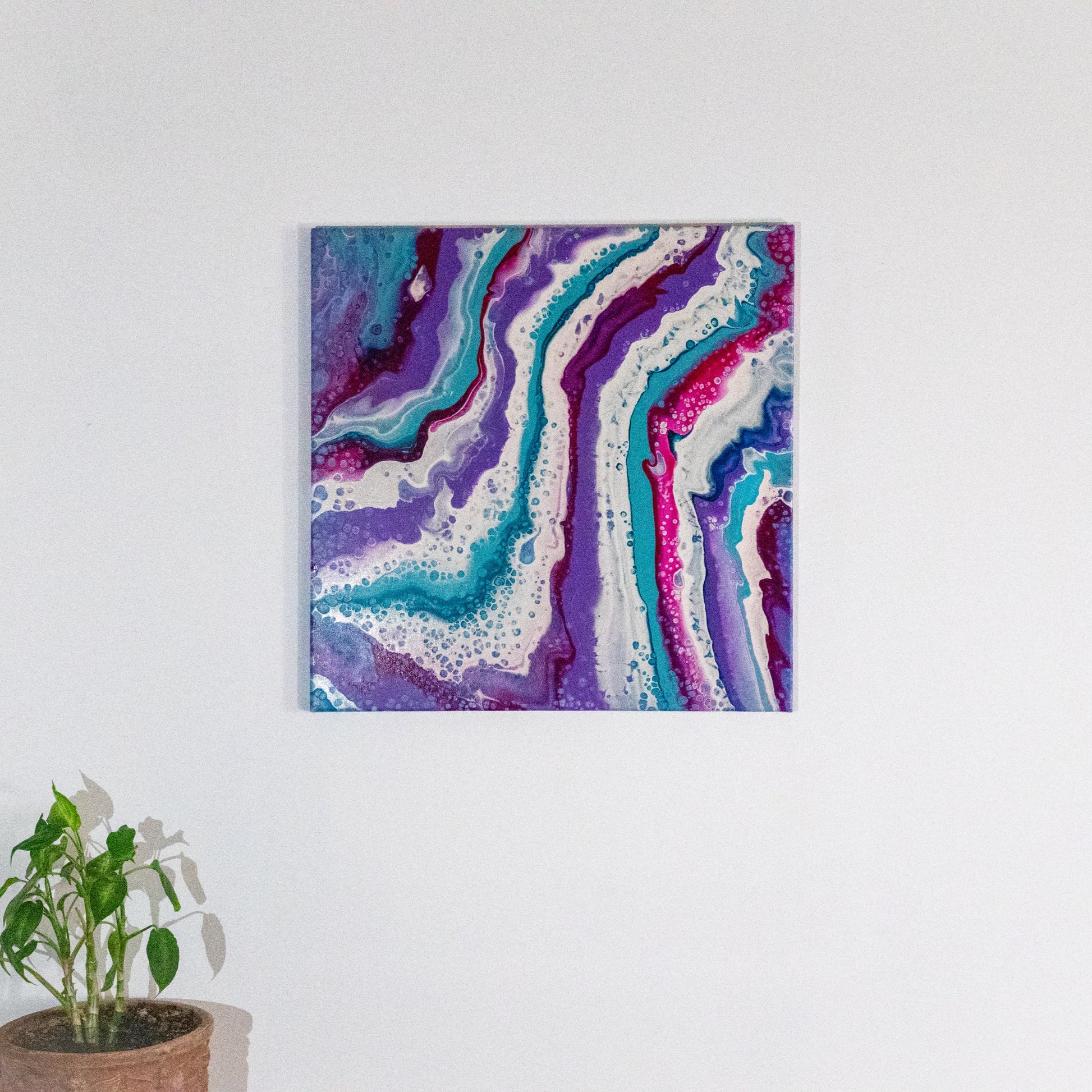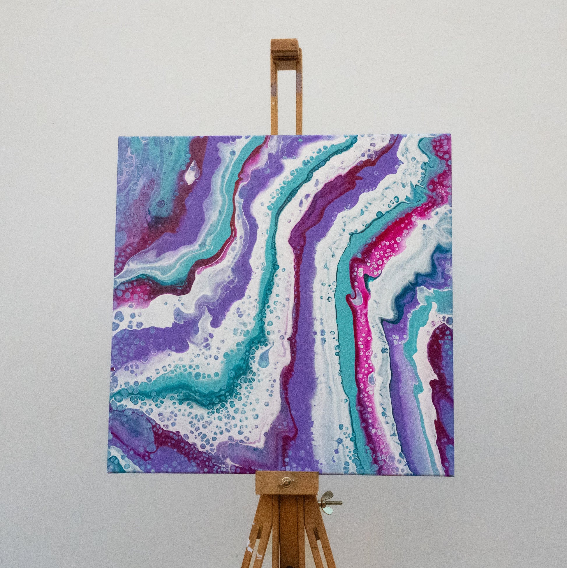 Realizzato a mano con colori acrilici su tela 50x50 cm, quest’opera sprigiona una sensazione di calma e armonia, come una carezza di luce che scorre fluida e vellutata.