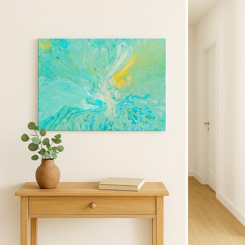 Questa creazione è dedicata all'aria, essa prende vita da pennellate fluide di azzurro, verde acqua e giallo ocra che si intrecciano creando un vortice etereo che ricorda la brezza, le nuvole e la libertà, raggi di sole accompagnano le leggere nuvole creando movimento e infondendo serenità.