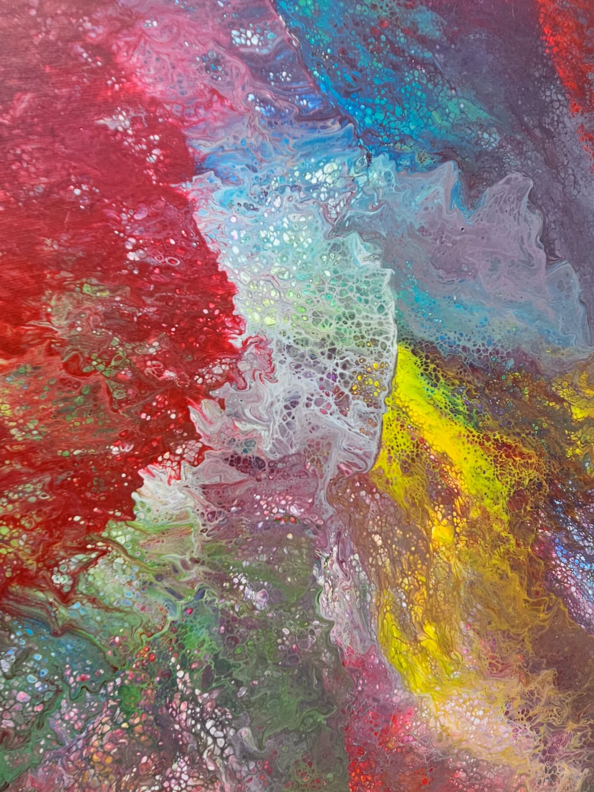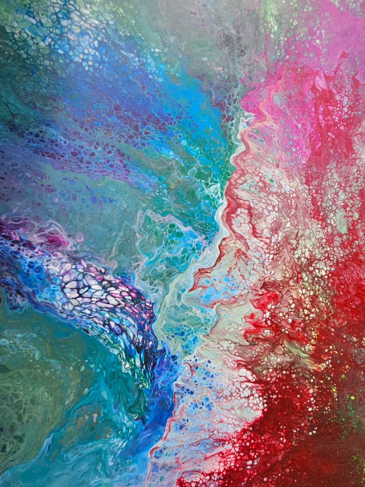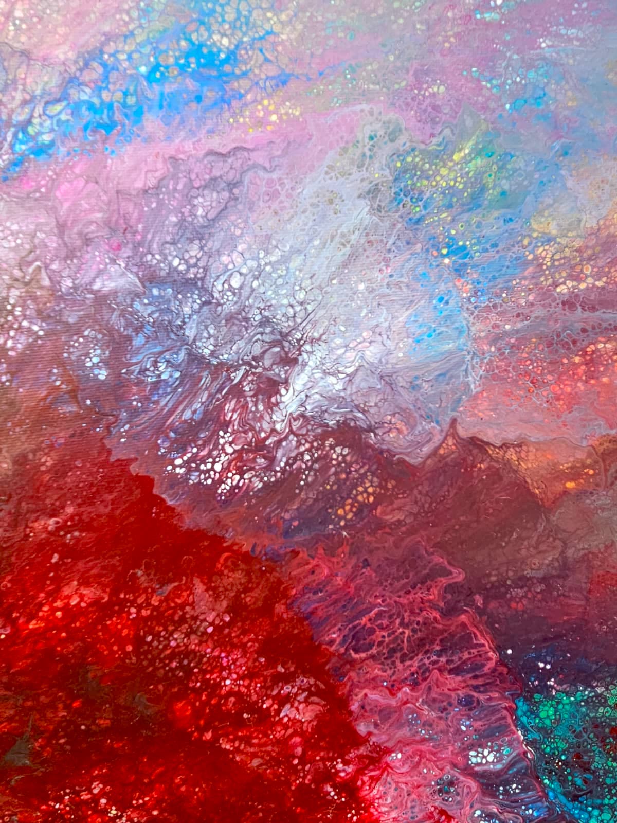 L’acrylic pouring dà vita a una texture dinamica e profonda, dove il colore si muove liberamente, formando contrasti luminosi tra sfumature di cremisi, arancio e oro.
